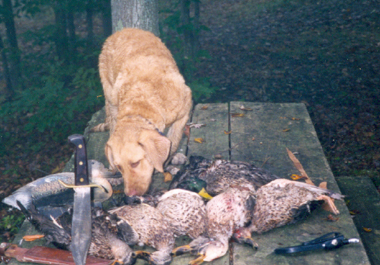 LongMeadow' Northern Traveling Storm ("Stormy") at six months of age back from her first day of hunting. Storm is a from our 2003 litter by Hitchcock & Talie.